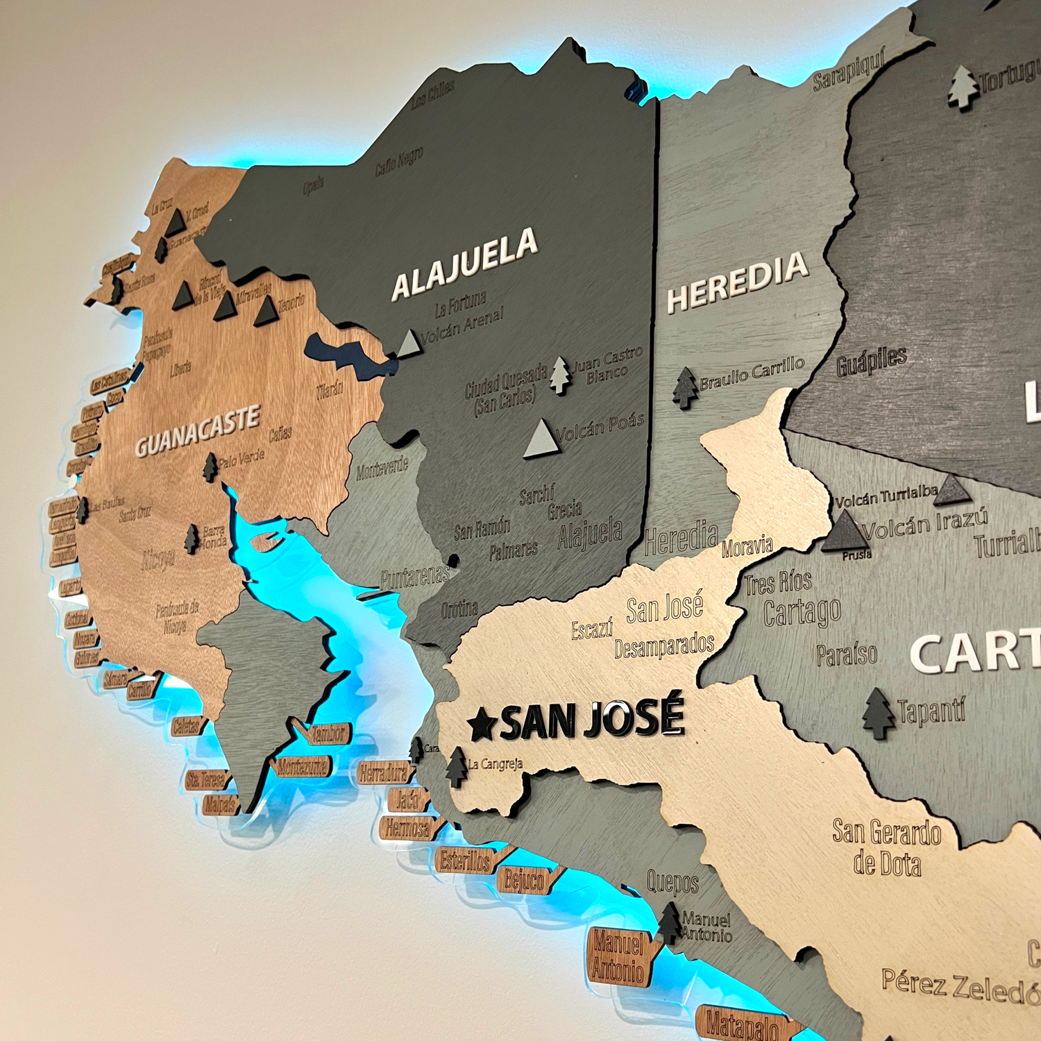El Mapa de Costa Rica de Agathos está diseñado para reflejar la belleza y diversidad de nuestro país con un estilo moderno, elegante y lleno de carácter.